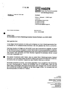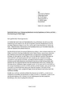 Der Oberbürgermeister der Stadt Hagen, Herr Denis Rehbein wurde mit Schreiben vom 29. Januar 2026 über den Rechtsfall Arthur Levy für eine Stellungnahme orientiert. In seinem Antwortschreiben vom 12. Februar 2026 verzichtet der Oberbürgermeister auf eine Stellungnahme, dies ungeachtet davon, dass die Stadt Hagen Anteilseignerin der öffentlich-rechtlichen Sparkasse an Volme und Ruhr ist (ehemals Sparkasse Hagen). Der Oberbürgermeister macht lediglich darauf aufmerksam, dass er sich im Namen der Stadt Hagen nicht zu einem laufenden Rechtsverfahren äussern könne.